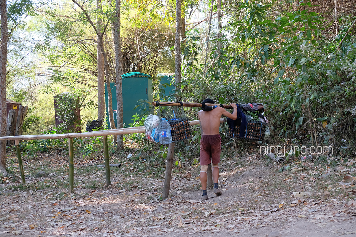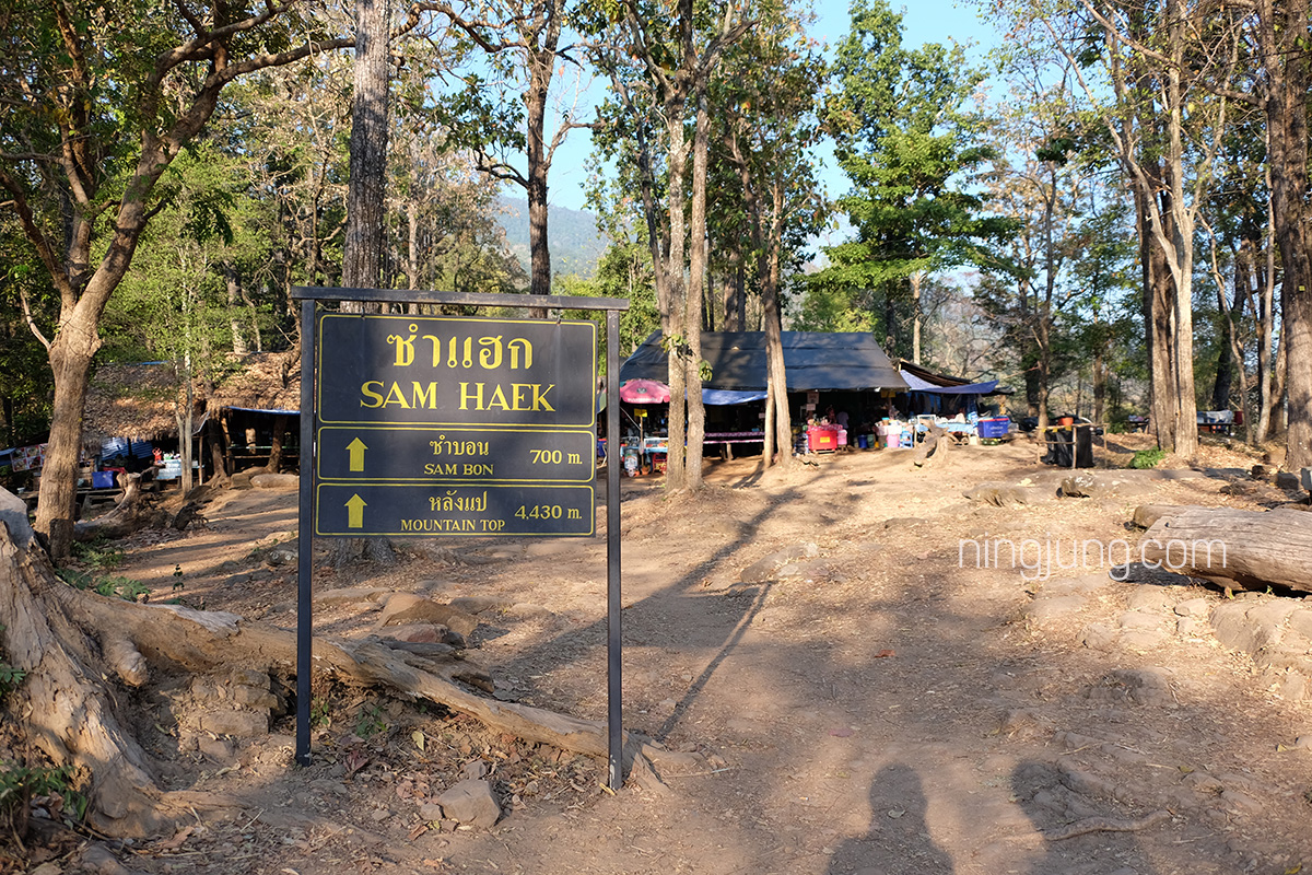 7.30 – 8.05 น. ที่ทำการ – ปางกกค่า – ซำแฮก (1,000 ม.) เดินระยะแรก เหนื่อยมาก HR ขึ้นสูงตลอด คิดว่าร่างกายกำลังปรับตัว โดยเฉพาะ 15 นาทีแรก กำลังจะอยากพัก ก็ถึงซำแฮกพอดี มีคนเดินขึ้นพร้อมๆ กันนิดหน่อย ลูกหาบมีมาเป็นระยะๆ ต้องคอยหลบทางให้ วิวข้างทางค่อนข้างแห้งแล้งเนื่องจากเป็นหน้าหนาว ฝุ่นเยอะ ยังเช้าอยู่ อากาศไม่ร้อนเท่าไหร่