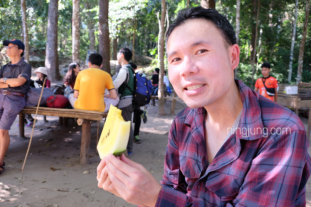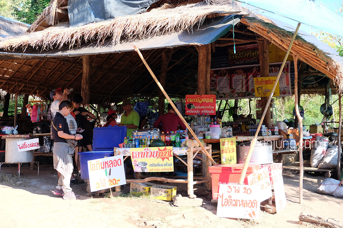 8.35 – 8.50 น. ซำบอน – ซำกกกอก – ซำกอซาง (800 ม.) ช่วงนี้ก็ยังเดิน เดิน เดิน ระยะทางแต่ละ check point ค่อนข้างสั้น เลยแวะถ่ายรูปร้านค้าบ้าง ของกินบ้าง ของกินก็มีทุกอย่างที่คนเหนื่อยๆ ร้อนๆ อยากกิน ตั้งแต่น้ำแดงโซดา เฉาก๊วย ไอติม สปอนเซอร์ แตงโม หรือของเพิ่มพลังอย่างไข่ปิ้ง ข้าวเหนียวปิ้ง จนถึงอาหารตามสั่ง ที่สังเกต ทุกจุดพักจะมีที่พักของลูกหาบ เป็นบาร์ไม้ให้ย่อตัวแล้วเอาของที่แบกวางได้ ลูกหาบบางคนก็จะเปิดเพลงไปตลอดทาง ตั้งแต่เพลงเก่า เพลงลูกทุ่ง เพลงร็อค แล้วแต่ความชอบ ทำให้ผ่อนคลาย ลืมความเหนื่อยกันไปทั้งลูกหาบและนักท่องเที่ยว