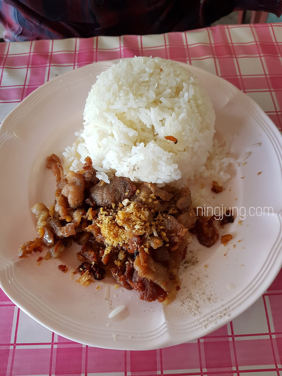 ไปรับกุญแจบ้านพักแล้ว ออกมากินข้าวเที่ยง มื้อแรกบนภูกระดึง ข้าวหมูทอดกับข้าวคะน้าหมูกรอบร้านป้าจอมดุ และโค้กเย็นๆ ขวดละ 40 บาทถ้วน
