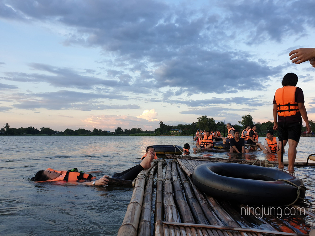 แดดร่มลมตก ก็ได้เวลาล่องแพเปียกที่แม่น้ำบางขาม (ก็ริมน้ำบ้านสวนขวัญเลย) ใส่ชูชีพแล้วลงไปโลด ด้วยเพื่อนร่วมทริปที่ล้วนเป็นวัยเกษียณ ลงแพก็จะมีกรีดร้อง โวยวายกันบ้าง เพราะแพมันจะจมน้ำอยู่หน่อยๆ ไปได้ซักพักก็เริ่มชิน ลมเย็นๆ บรรยากาศชิลๆ นั่งบนแพเปียกๆ เอาขาลงน้ำ ปล่อยใจไปเรื่อยๆ เป็นอีกครั้งที่รู้สึกว่ามีความสุขกับธรรมชาติอย่างแท้จริง