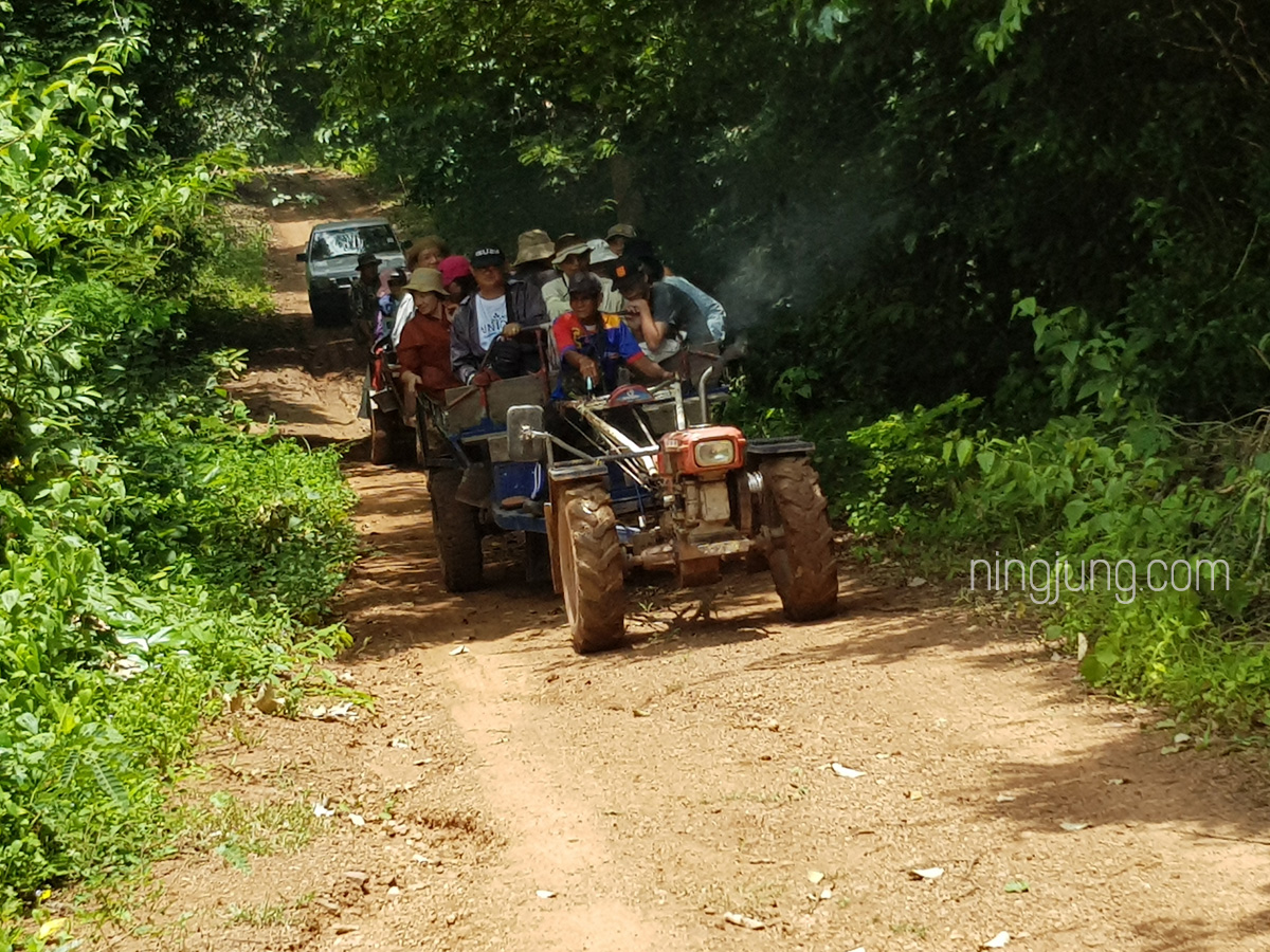 ก่อนถึงจุดเริ่มการเดินป่า เราจะต้องนั่งรถอีแต๊กเข้าไปจากสถานที่ทำการหลายกิโลอยู่ เพราะใช้เวลาเป็นชั่วโมงเหมือนกัน รถอีแต๊กก็ตามภาพ ขโยกขเยกไปตลอดทาง ลงหลุมมีน้ำก็ประเด็นเข้าหน้าเข้าตากันไป คือยังไม่เริ่มเดินก็เหนื่อยแล้ว (คล้ายบรรยากาศรถขนหมูที่พม่า แต่มันโยกเยกกว่าเยอะ แถมนั่งบนไม้กระดานแผ่นเดียว ต้องทรงตัวดีๆ) เมื่อถึงจุดเริ่มเดินก็กินข้าวเที่ยงกันเลย ทีแรกเจ้าหน้าที่จะให้กินในป่า แต่ดูสภาพแล้ว กินเลยละกัน เพราะคณะพวกเรามาถึงค่อนข้างช้ากว่าเวลาที่กำหนด