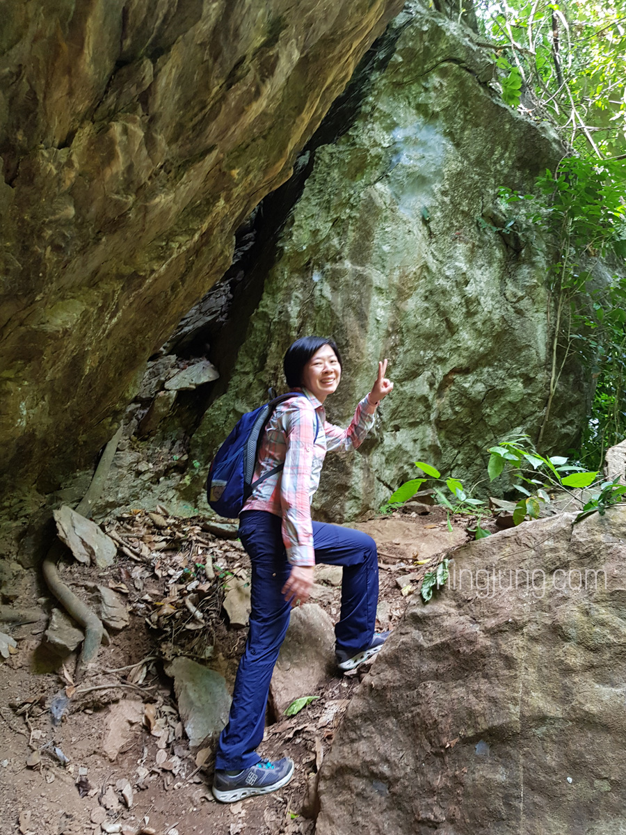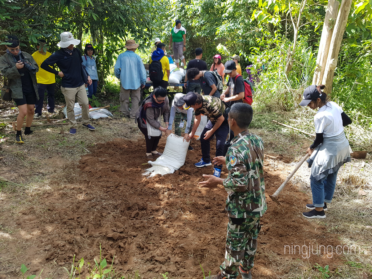 กินข้าวเสร็จก็นั่งรถอีแต๊กอีก 300 เมตร ไปยังจุดเดิน ถึงจุดเดินมีพี่ๆ บางคนขอนั่งรอ เพราะน่าจะเดินไม่ไหว ความจริงเอาพี่เค้าขึ้นรถอีแต๊กมานี่ก็นับว่าโหดอยู่ เพราะบางคนก็ถือไม้เท้าแล้ว แต่ก็มาด้วยกันจนได้ เดินเข้าป่าครั้งนี้คือเดินไปที่น้ำตกแห่งหนึ่ง ซึ่งระยะแรกก็เป็นพื้นราบ เดินยังไม่ทันเหนื่อยก็เปลี่ยนจากเดินเป็นปีน และจุดปีนนี่เองที่ชันใช้ได้ แถมลักษณะจะไม่ใช่ทางที่เป็นทางเดินป่าประจำ เพราะเจ้าหน้าที่นำทางเดินไปก็ถือมีดฟันหญ้าไป 555 บางจุดก็ลื่นเพราะมีตะไคร่น้ำ เดินไปถึงยอดก็พบว่าน้ำตกไม่มีน้ำ และต้องลงอีกทางซึ่งมีราวให้จับตลอด ต้องขอบคุณรองเท้า columbia อีกครั้ง ที่ช่วยให้การปีนไม่ยากลำบากจนเกินไป เมื่อกลับจากน้ำตก ชาวคณะไปทำโป่งช้างเทียมร่วมกันเพื่อเป็นอาหารให้ช้างและสัตว์อื่นๆ ในป่า ถือเป็น CSR ของทริปจ้า